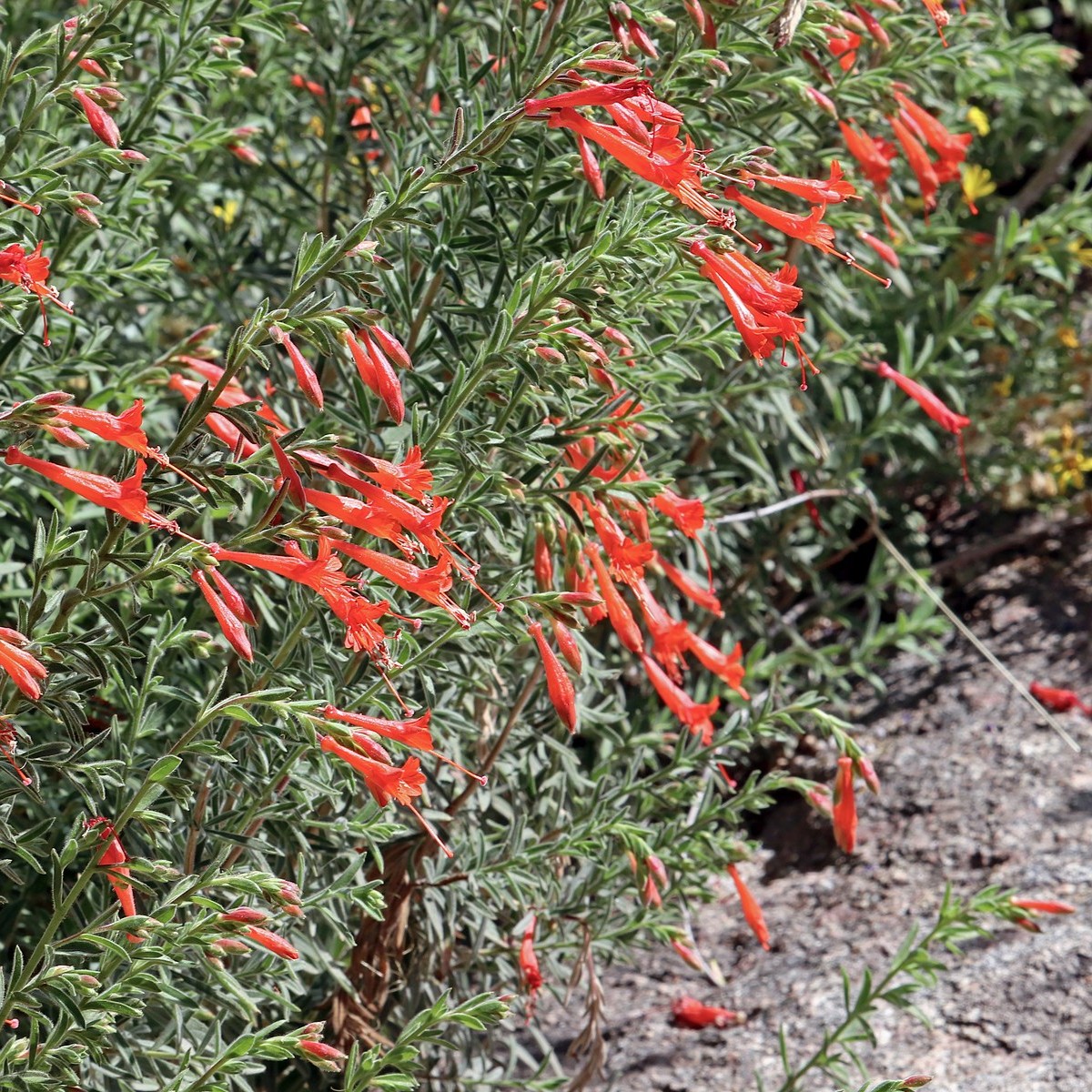 This low-growing, herbaceous subshrub has narrow, lance-shaped gray-green leaves covered with fine hairs. The plant produces numerous tubular, trumpet-shaped flowers in shades of scarlet to orange-red, which are highly attractive to hummingbirds. Blooming typically occurs from late summer through fall, when few other native plants are in flower. The plant spreads via rhizomes, forming a dense groundcover over time.​