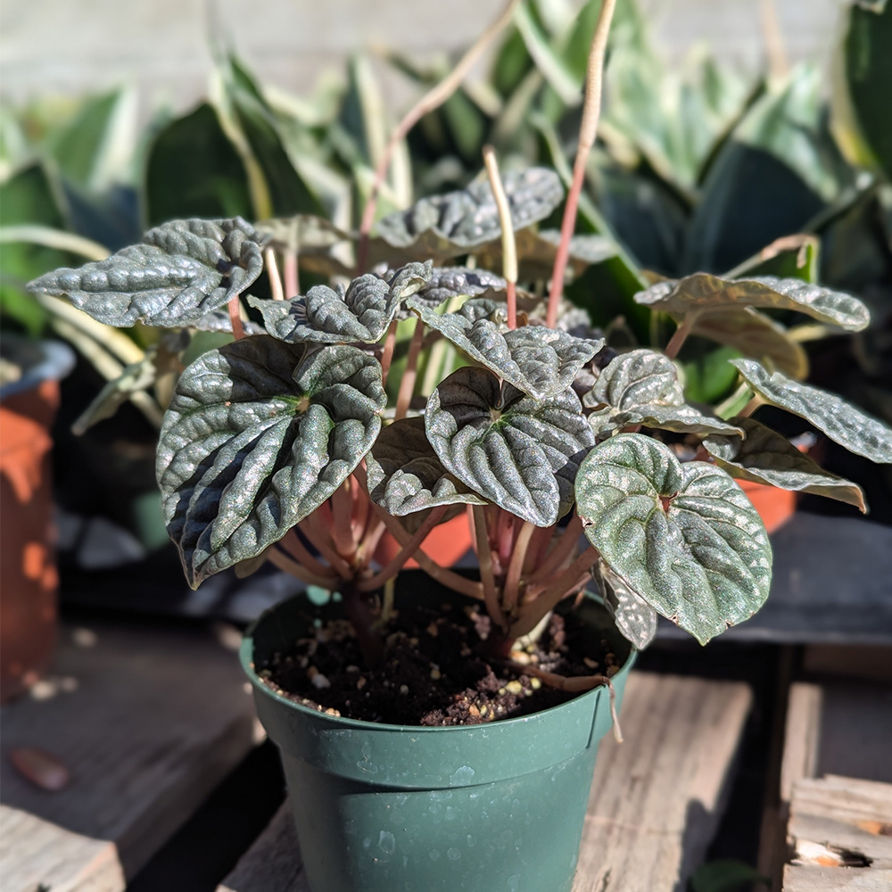 This eye-catching peperomia features rippled, heart-shaped leaves with a soft silver sheen and deep green veining. Its foliage has a sculptural quality that adds dimension and texture to any indoor space.
