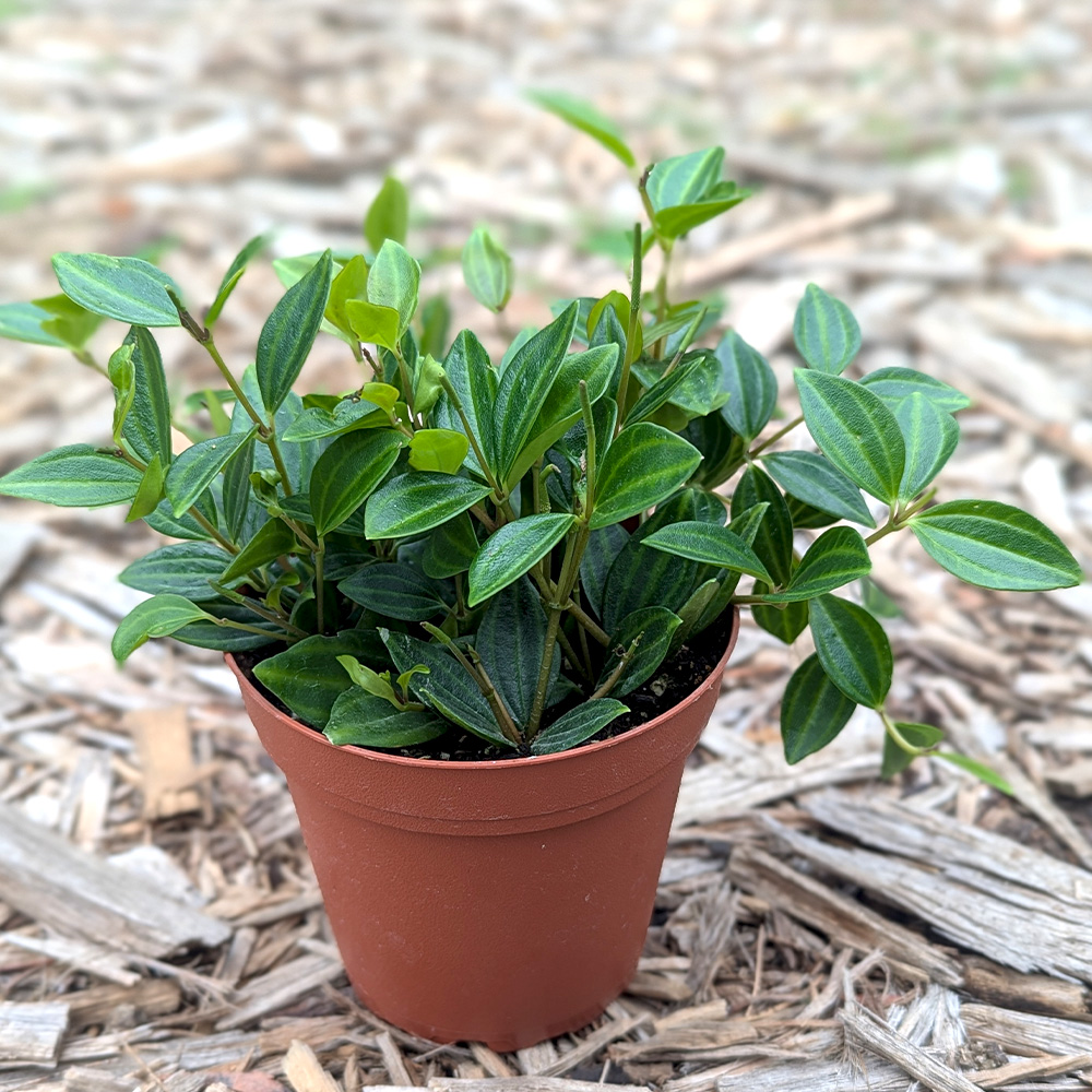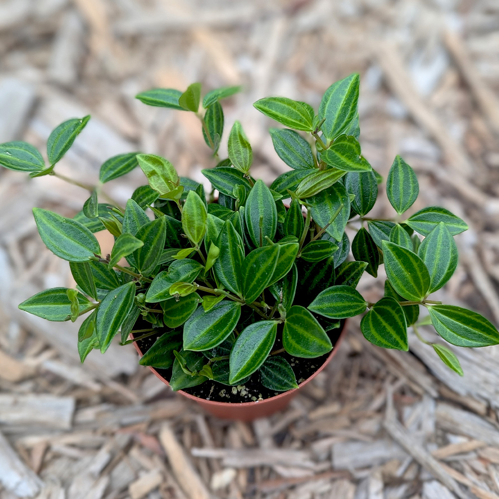 Peperomia angulata is a charming trailing plant loved for its decorative foliage and compact growth. Native to South America, it features deep green, narrow leaves with bright chartreuse striping that resemble the segmented body of a beetle. This variety is non-toxic, making it a safe and stylish choice for homes with pets or kids.