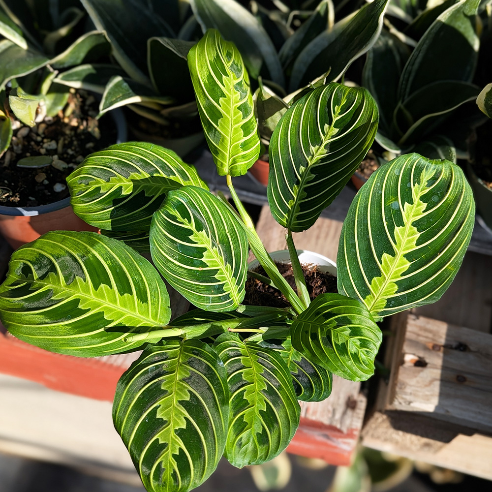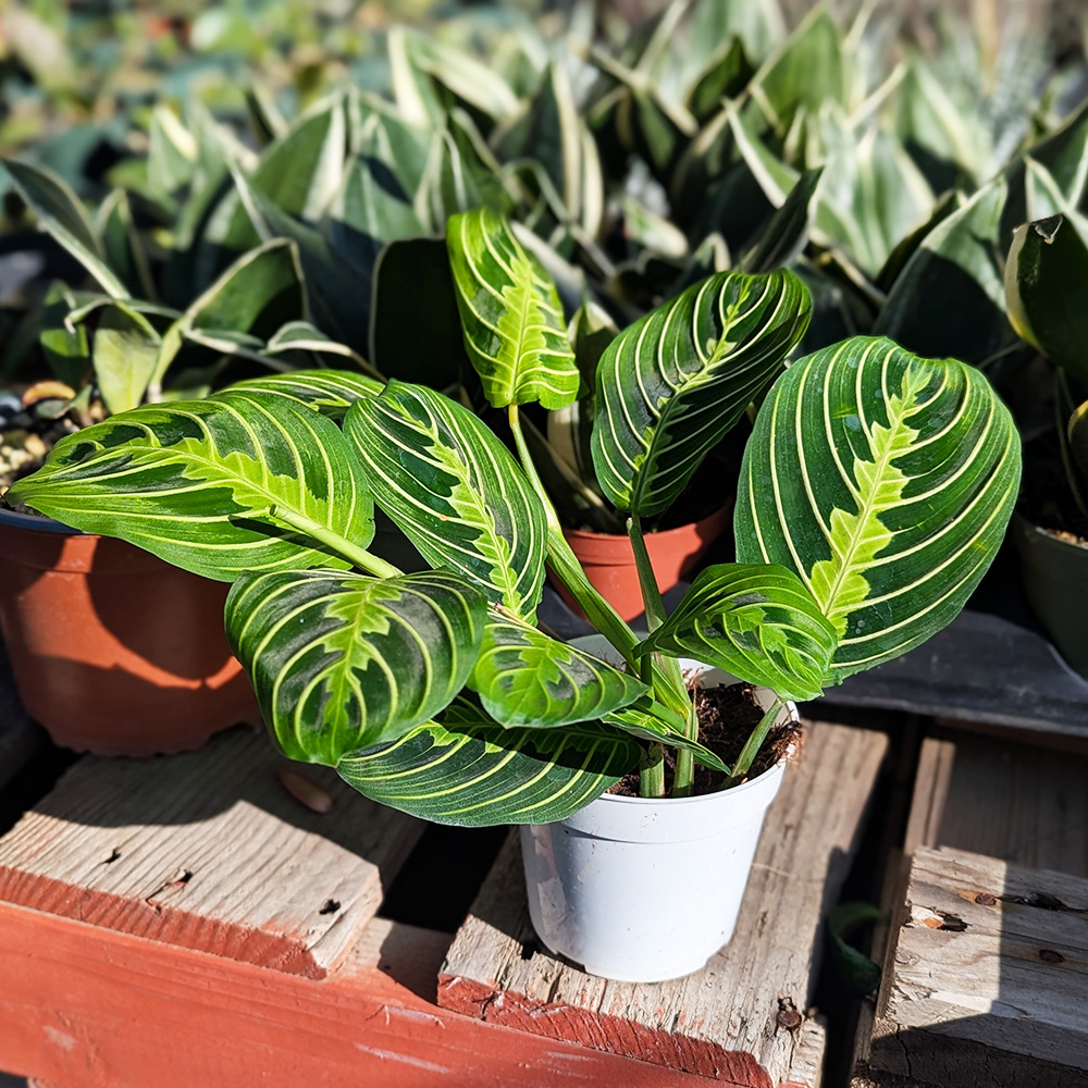 This variety of Maranta features oval-shaped leaves with a deep green base and vivid lime green veins running symmetrically along the midrib. The undersides are a soft maroon, adding even more visual interest. Known for its nightly leaf-folding behavior, the Prayer Plant is both interactive and decorative.