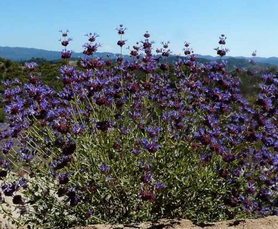 Salvia ‘Celestial Blue’ is a show-stopping hybrid sage with upright growth, aromatic gray-green foliage, and vivid violet-blue flowers that bloom in late winter through spring. A cross between native sages, this cultivar is tough, beautiful, and highly attractive to hummingbirds, bees, and butterflies.