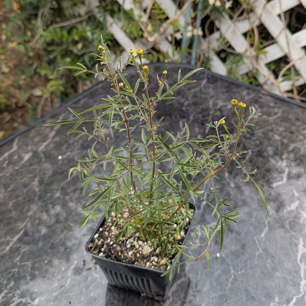 This sprawling shrub features soft, lacy green leaves that emit a strong, distinctive scent when brushed or crushed, often described as a mix of citrus, anise, and marigold. The plant produces clusters of small, bright yellow flowers that bloom in profusion, especially during the fall and winter months. Its airy, delicate texture and vibrant blooms make it a standout in various garden settings.